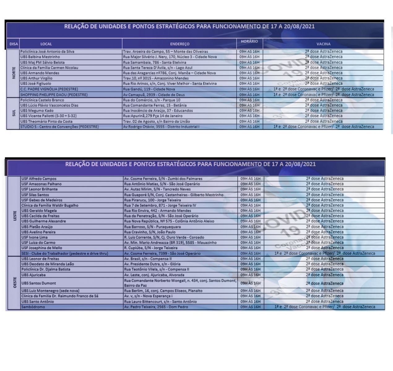 O público de 18 anos e mais e os remanescentes dos grupos prioritários que ainda não tenham tomado a primeira dose, deverão apresentar um documento de identidade original, com foto, CPF e um comprovante de residência, com cópia. Quem vai receber a segunda dose, deve levar o documento com foto, CPF e o cartão de vacina com o registro da primeira dose.