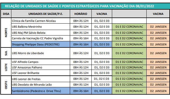 Manaus/AM - Neste sábado (8), Manaus possui 12 pontos de vacinação espalhados pela cidade, para quem for tomar a dose de reforço, a segunda dose ou até para quem ainda não tomou a primeira dose.