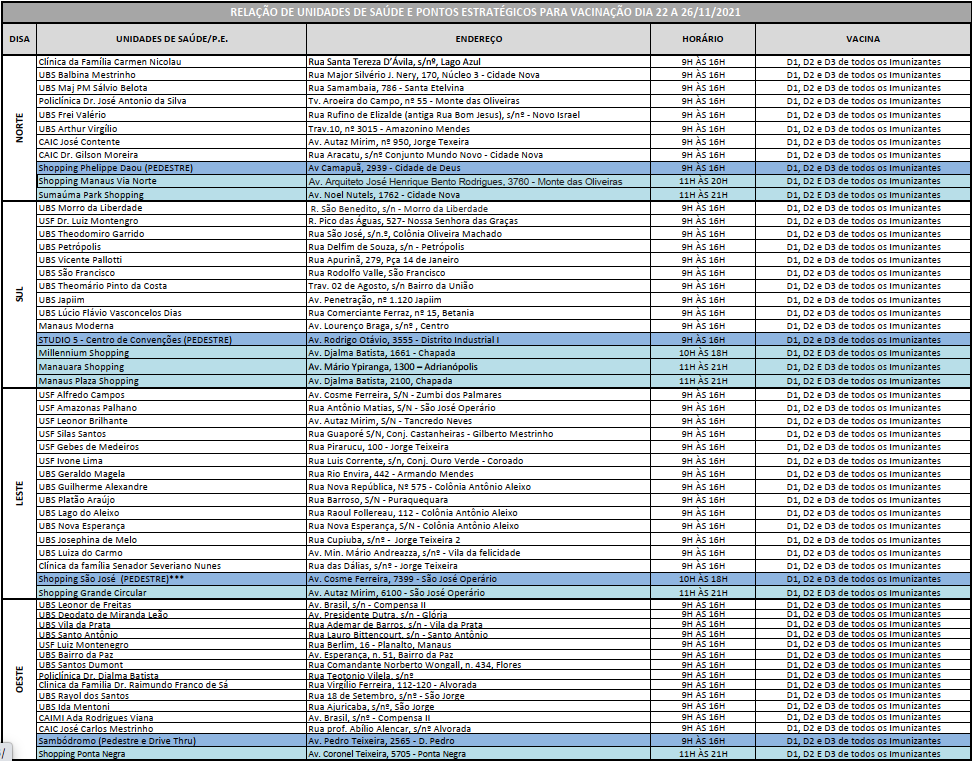 Manaus/AM- Manaus terá 21 pontos de vacinação contra a Covid-19 neste sábado (27). Os endereços podem ser acessados no site da Semsa ou na imagem no fim desta matéria. Confira a lista abaixo.