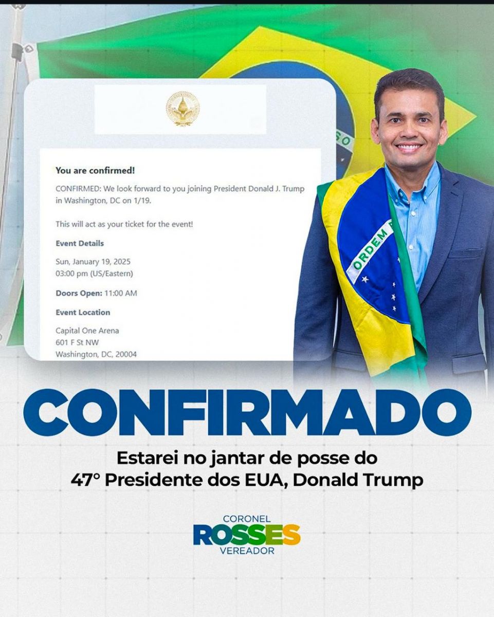 Manaus/AM - O vereador de Manaus, Coronel Rosses (PL), anunciou que participará do jantar de posse do presidente eleito dos Estados Unidos, Donald Trump, que ocorrerá em 20 de janeiro de 2025, no Capitólio, em Washington, D.C. Em suas redes sociais, Rosses compartilhou uma imagem do convite oficial e declarou: