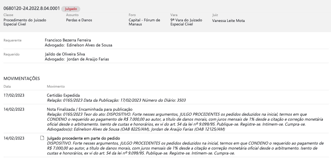 Jaildo foi condenado a indenizar o cobrador Francisco Bezerra por danos morais. O caso aconteceu em 2022, com o vereador chamando o profissional de “Francisco Perneta“ no plenário da CMM, alegando possuir imunidade parlamentar. O homem possui deficiência física.