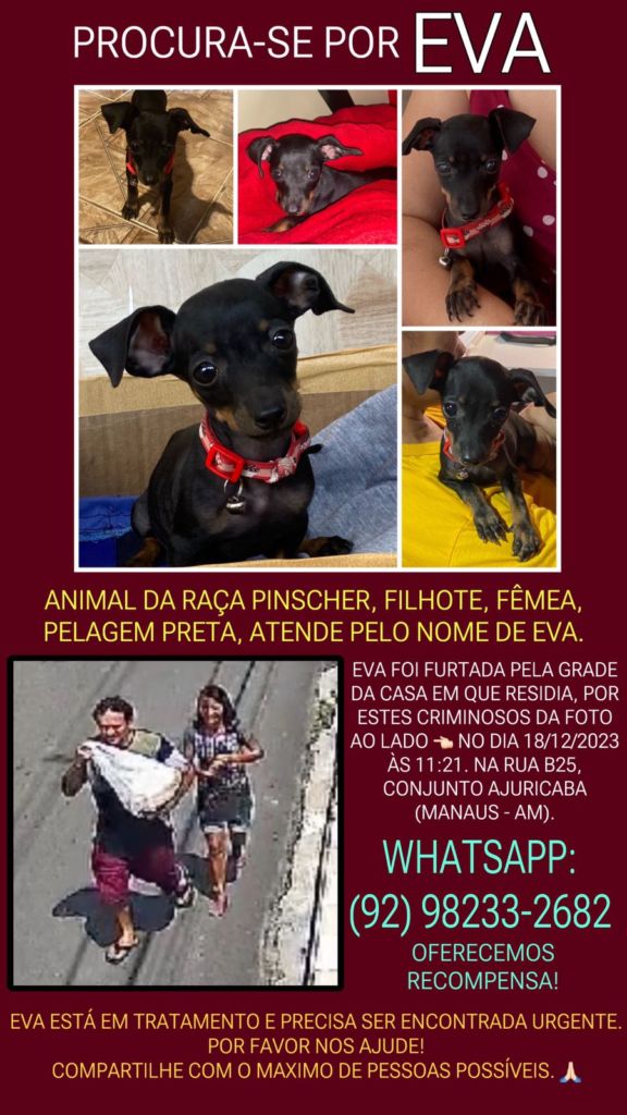 Os suspeitos aparecem se aproximando da residência, na sequência, o homem chama a atenção do animal, da raça Pincher, e consegue pegá-lo pelas grades. Após tirar a Eva da casa, o suspeito entrega para a mulher e os dois seguem andando normalmente pela rua com a cadela nos braços.