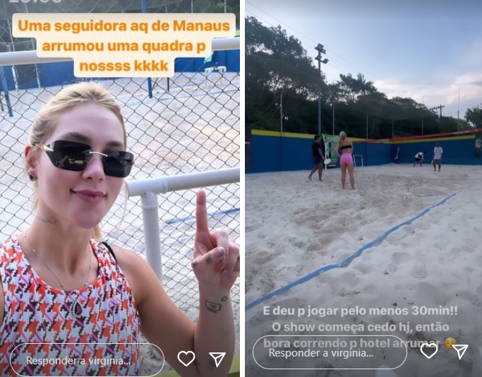O casal embarcou no jatinho particular comprado por Virginia e foi recepcionado por fãs no aeroporto. Mais tarde, a influencer mostrou que uma seguidora de Manaus alugou uma quadra de vôlei de praia para o casal jogar antes do show.
