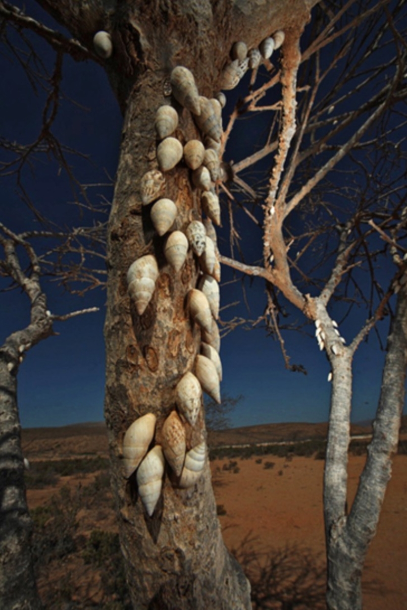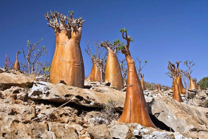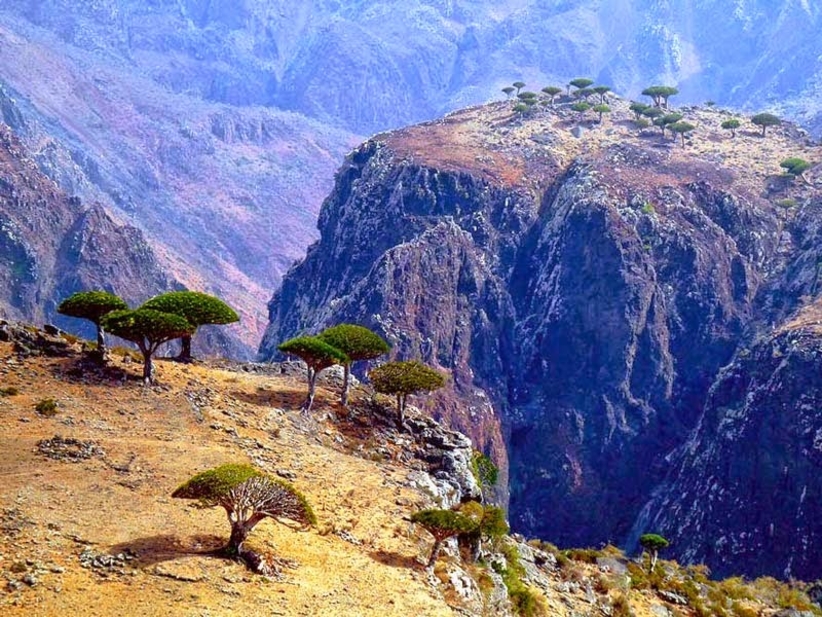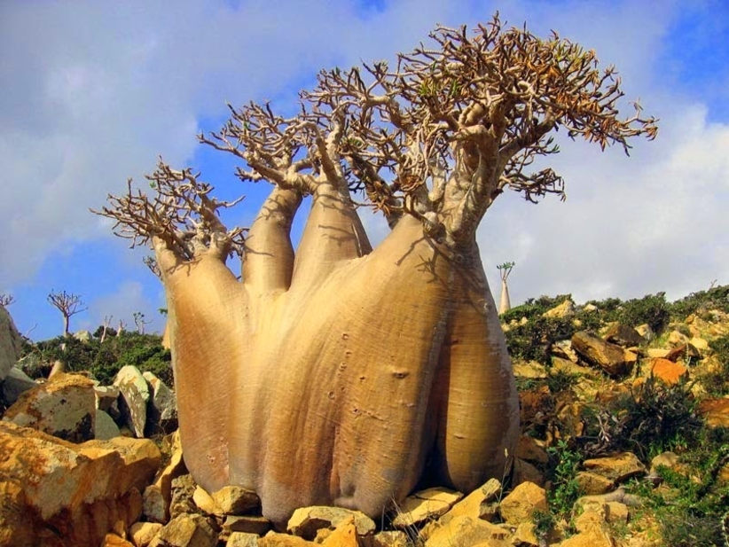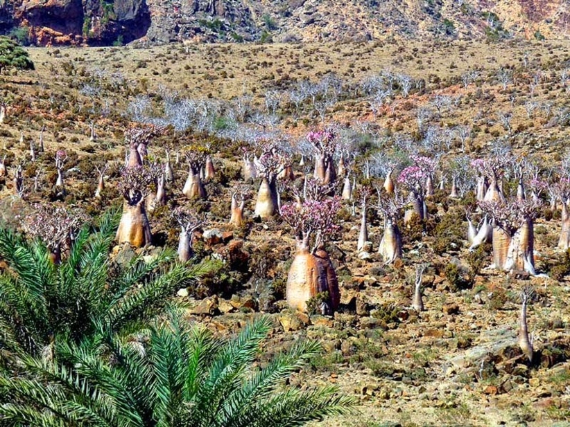 Umas das plantas mais estranhas de Socotra é a Dracaena cinnabari, uma árvore de estranha aparência com formas de guarda-chuva. Sua seiva, de cor vermelha, era buscada na antiguidade para ser usada na medicina ou na tinturaria. Fonte: Mdig