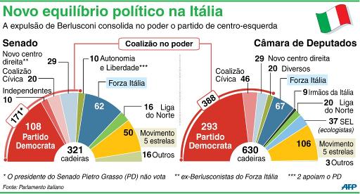 Sua expulsão não afetará a estabilidade do governo de coalizão de esquerda-direita liderado por Enrico Letta. Na véspera, ele aprovou sem problemas a lei orçamentária para 2014, apesar de Berlusconi e seus parlamentares terem passado para a oposição.