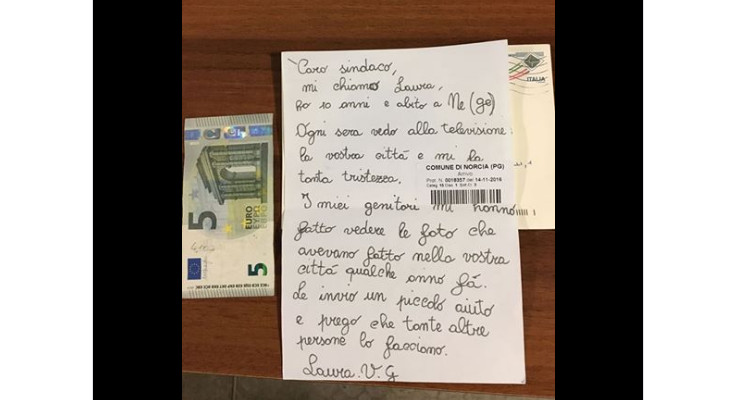 Conforme a publicação, uma menina italiana decidiu escrever uma carta ao prefeito de Nórcia e, junto dela anexou 5 euros para ajudar as pessoas afetadas, na carta dizia o seguinte: