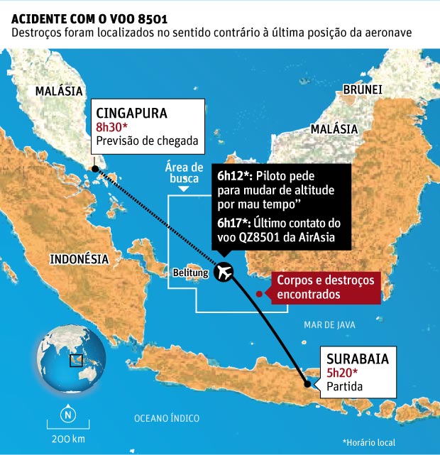 O voo QZ8501 decolou da cidade de Surabaia às 5h20 locais do dia 28 de dezembro e deveria chegar a Cingapura duas horas depois, mas caiu no mar de Java após 40 minutos de voo.