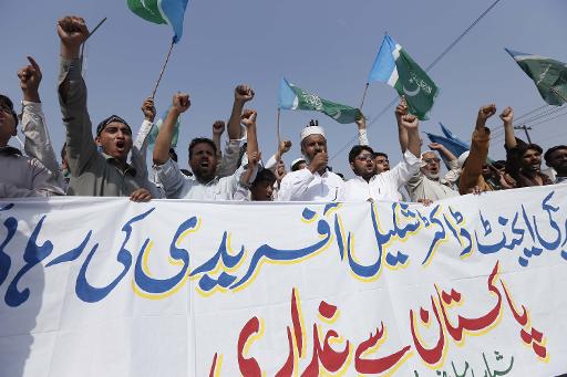 ©afp.com / Hasham Ahmed - Ativistas paquistaneses do partido político islâmico Jamaat-e-Islami gritam palavras de ordem contra um médico que teria ajudado a CIA a capturar o ex-líder da Al-Qaeda, Osama bin Laden, em 30 de agosto de 2013