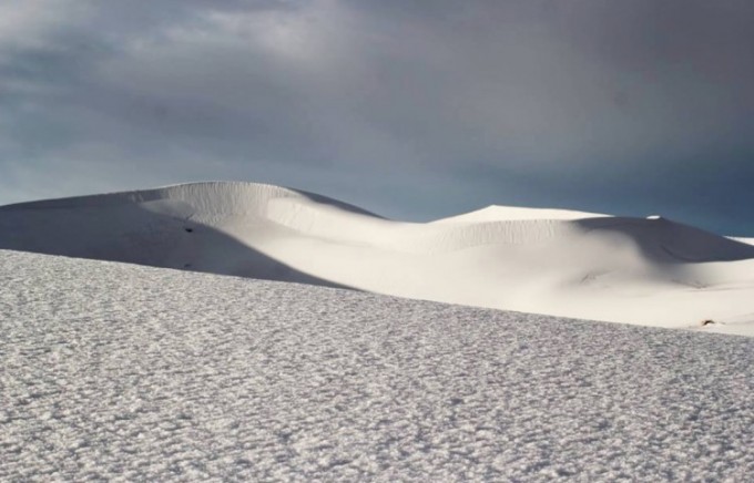 A paisagem “congelada” não durou muito, conforme as temperaturas subiam ao longo do dia. Mas foi o tempo suficiente para crianças brincarem de trenó nas dunas e fazendo bonecos de neve.