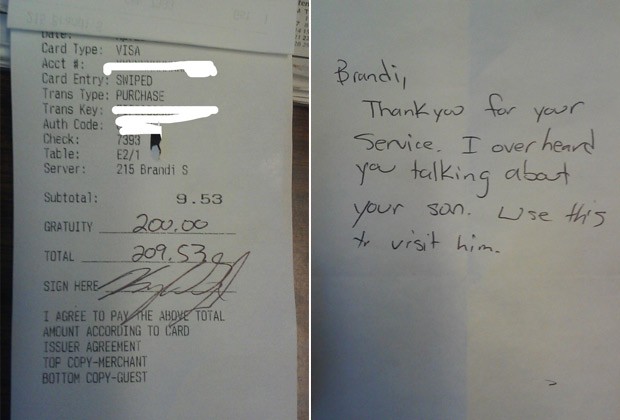 “Brandi, obrigado pelo seu atendimento. Eu escutei sua conversa sobre seu filho. Use esse dinheiro para visitá-lo”, escreveu.