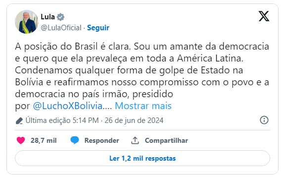 O presidente Luiz Inácio Lula da Silva (PT) comentou sobre a tentativa de golpe na Bolívia, nesta quarta-feira (26), nas redes sociais.