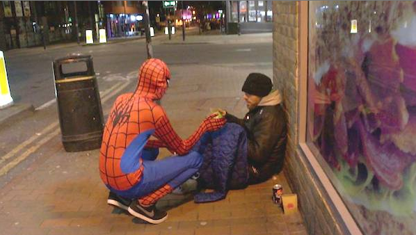Poderia ser uma história de cinema, mas é pura realidade. Em Birmingham, na Inglaterra, um jovem anônimo de apenas 20 anos se veste todas as noites de Homem-Aranha para conversar e dar comida aos moradores de rua da cidade.