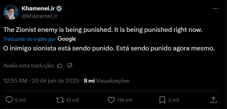 "O inimigo sionista cometeu um grande erro, um grande crime; deve ser punido e está sendo punido; está sendo punido neste exato momento", disse Khamenei em um post no X.