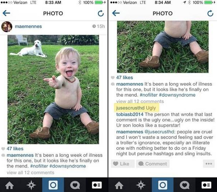 "Mas o que dizer de você estar buscando fotos de nossos filhos de propósito? E sobre o fato de uma bela fotografia de meu filho ter sido manchada por seu ódio? Isso não é uma piada. Isso é cyberbullying".