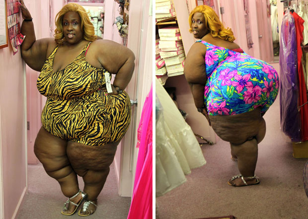 Uma mulher de 203 kg afirma ter uma das maiores bundas do mundo, medindo mais de 2,1 m de largura. Ela fez sucesso em grupos apreciadores de grandes curvas na internet depois de colocar fotos tiradas por um amigo fotógrafo após emagrecer.