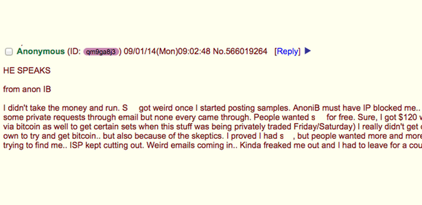 "Eu não peguei o dinheiro e fugi", escreveu o internauta. "As coisas ficaram estranhas quando comecei a postar amostras. As pessoas queriam tudo de graça. Eu ganhei US$ 120 na minha conta de bitcoins, mas quando você pensa em quanto tempo foi empregado em adquirir este material (eu não sou o hacker, só um colecionador), e o dinheiro (eu paguei muito via bitcoin para conseguir certas coleções quando elas começaram a ser comercializadas em particular na sexta e no sábado), eu realmente não cheguei nem perto do que estava esperando."