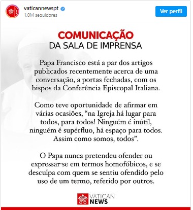 Em nota, o porta-voz do Vaticano, Matteo Bruni, disse que o pontífice "nunca teve a intenção de ofender ou de se expressar em termos homofóbicos e se desculpa com quem se sentiu ofendido pelo uso de um termo que foi denunciado por outros" e que o papa já falou em várias ocasiões que "na Igreja há lugar para todos".