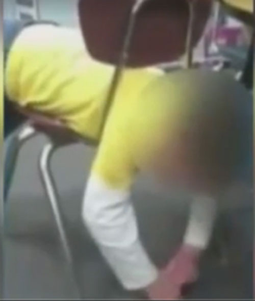 A professora pode ser ouvida durante a gravação dizendo: “Como você chegou nessa situação”. A filmagem foi entregue a uma estação de TV americana por Patrick Greenfelder, um advogado dos pais do menino, que dizem que ele ficou preso na cadeira de 10 a 15 minutos.