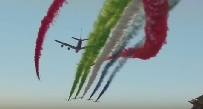 O vídeo é uma das muitas filmagens no Youtube que registraram a participação de uma das patrocinadoras do Grande Prêmio de Fórmula 1 de Abu Dhabi, ocorrido no último domingo (27). O A380 da Etihad Airways foi seguida por sete caças Aermacchi MB-339, que pertencem à esquadrilha de demonstração aérea dos Emirados Árabes Unidos.