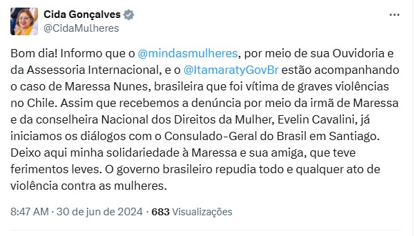 A ministra da mulher Cida Gonçalves informou na rede social X (antigo Twitter) que acompanha o caso.