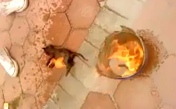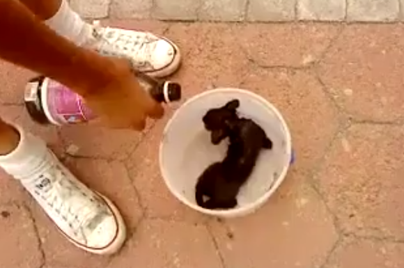 Usando uma vasilha, colocam o filhote dentro e passam a molhar o animal com uma substância combustível para em seguida e com gargalhadas de satisfação atear fogo.
