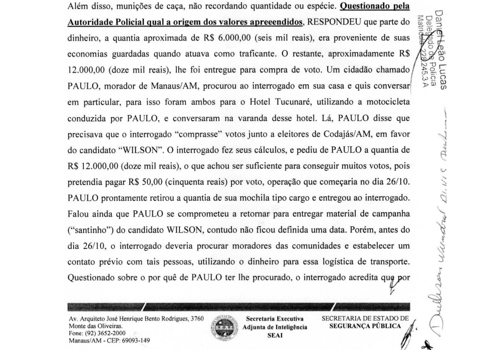 “Chegou ao nosso conhecimento que naquela operação em que foi presa a delegada por corrupção e envolvimento com o tráfico no município de Codajás um dos traficantes que foi preso confessou que tinha dinheiro para compra de votos do Wilson Lima. Por conta desse fato e do fato que aconteceu em Nhamundá no 1º turno e pela semelhança dos dois, nós peticionamos ao presidente do Tribunal para comunicar o crime e para tomar as medidas necessárias”, disse o advogado Daniel Nogueira.