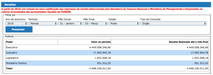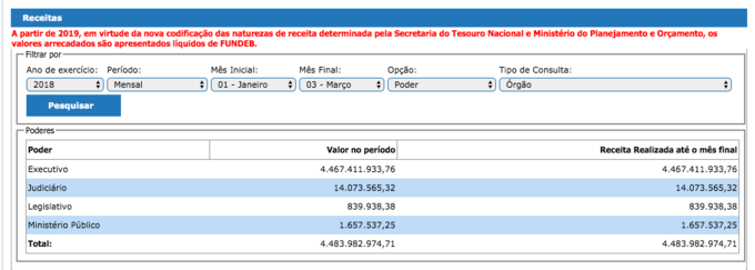 Segundo o site da Secretaria de Estado de Fazenda (Sefaz), a somatória da receita dos poderes Executivo, Judiciário, Legislativo e Ministério Público fechou em R$ 4,449 bilhões, no período de janeiro a março deste ano, R$ 18 milhões a menos que o mesmo período do ano passado, quando registrou R$ 4,467 bilhões.