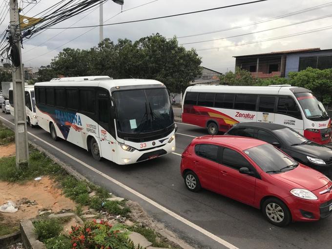 A categoria reivindica reajuste salarial e protesta contra a decisão de empresários de contratar transportes ‘piratas’ para fazer os translado de funcionários do Distrito Industrial.