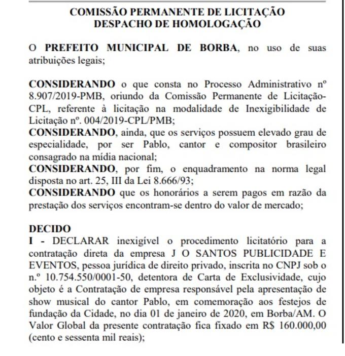 Manaus/AM - O cantor Pablo será atração principal na Festa de fundação da cidade de Borba, que será realizada no dia 1º de janeiro de 2020. O cachê do cantor de R$ 160 mil será pago pela Prefeitura de Borba, conforme contrato publicado no Diário Oficial dos Municípios do Amazonas nesta segunda-feira (30).