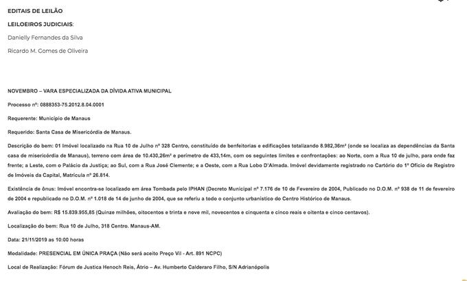Manaus/AM - O prédio histórico onde a Santa Casa de Misericórdia de Manaus funcionou por mais de um século irá a leilão no dia 21 de novembro por ordem da Vara Especializada da Dívida Ativa Municipal - Vedam. Em decisão publicada, a juíza Ana Maria Diógenes, acolhendo pedido formulado pela Procuradoria do Município de Manaus e considerando que o imóvel está em vias de perecimento, autorizou o venda do prédio. Ao contrário do que se imagina, o imóvel é particular e pertence à própria entidade, a qual foi constituída perante a Lei como associação privada.