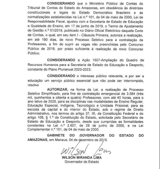 A autorização foi publicada no Diário Oficial do Estado da última sexta-feira (6), assinado por Wilson Lima. O documento explica que o processo seletivo deve ser realizado no prazo de 180 dias, conforme orientação do Ministério Público de Contas do Amazonas (MPC-AM). O certame visa suprir supostas vagas não preenchidas no concurso público de 2018.