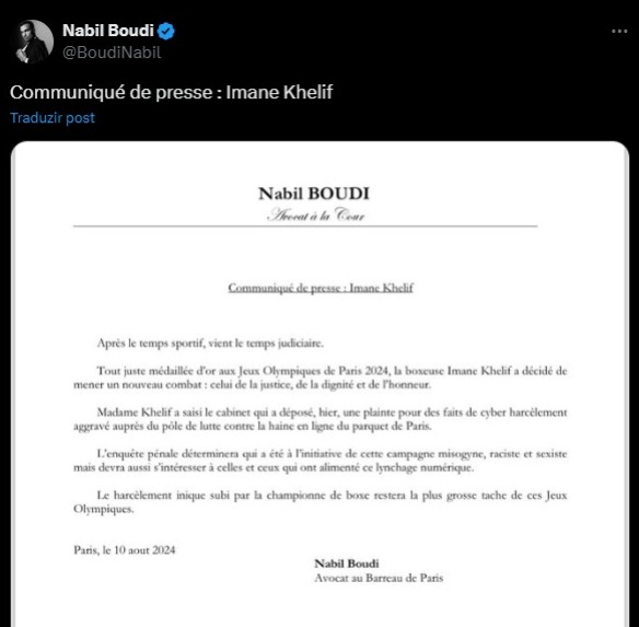 Mesmo enfrentando ataques online, Khelif avançou na competição e se tornou campeã. Em comunicado, a boxeadora afirmou: “Após o tempo esportivo, vem o tempo judicial”. O escritório de advocacia apresentou a queixa ao polo de combate ao ódio online da Promotoria de Paris.