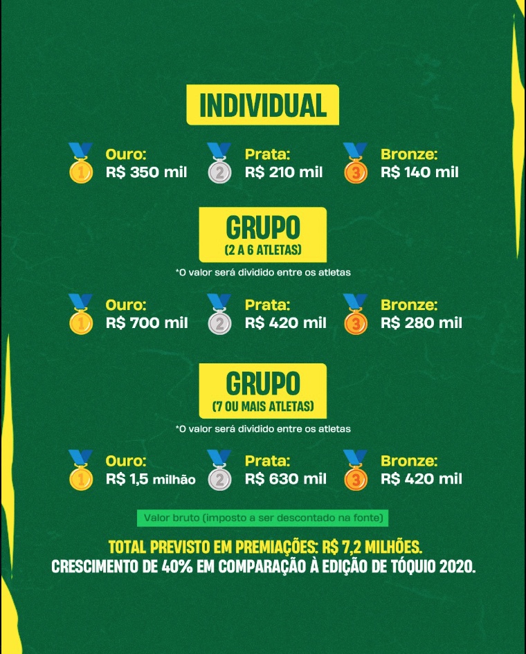 - Medalha de Ouro: R$1,5 milhão.