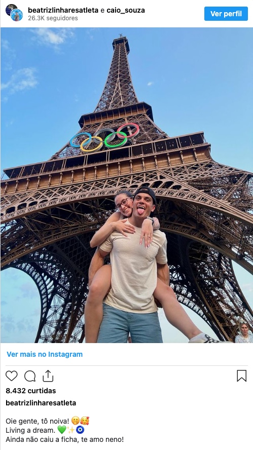 Os ginastas brasileiros Caio Souza, de 30 anos, e Beatriz Linhares, de 21 anos, aproveitaram a Olimpíada de Paris 2024 para anunciar o noivado. O casal compartilhou a novidade com seus seguidores nas redes sociais, publicando uma foto romântica aos pés da Torre Eiffel.