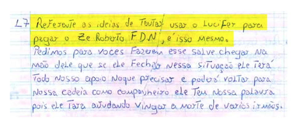 Em um dos bilhetes dizia: “Referente às ideias de tentar usar o Lúcifer para pegar o Zé Roberto FDN, é isso mesmo. Pedimos para vocês fazerem esse salve [comunicado] chegar na meta [cela] dele que, se ele fecha nessa situação, ele terá todo nosso apoio no que precisar e poderá voltar para nossa cadeia como companheiro. Ele tem nossa palavra, pois ele tava ajudando vingar a morte de vários irmãos”.
