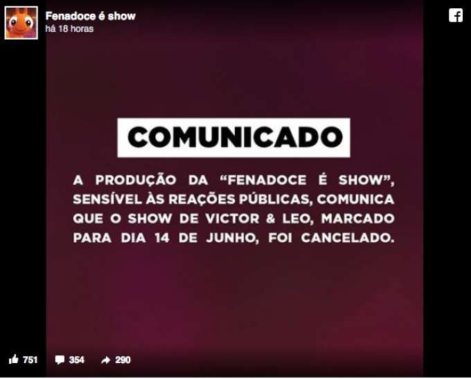 “A produção da 'Fenadoce é show', sensível às reações públicas, comunica que o show de Victor e Leo, marcado para o dia 14 de junho, foi cancelado”, informa o comunicado.