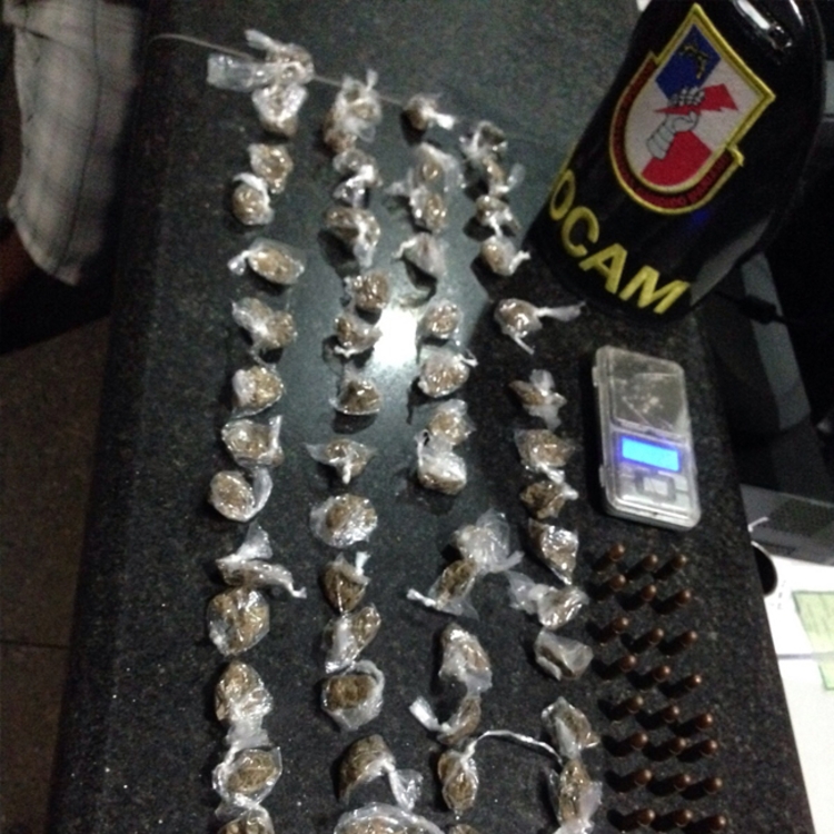 Com ele foram encontradas porções de maconha, balança de precisão e 24 munições intactas de calibre 765.