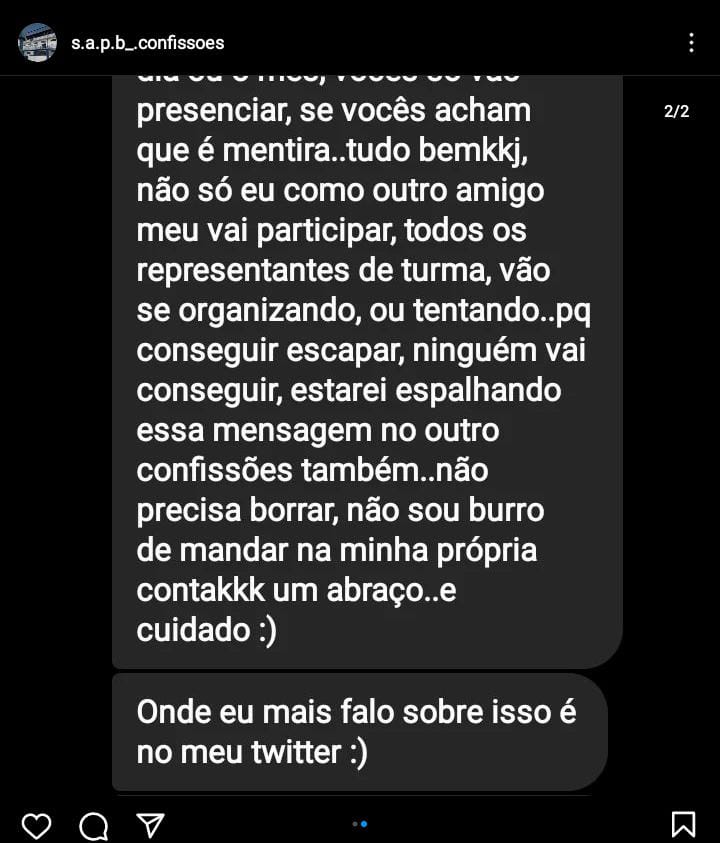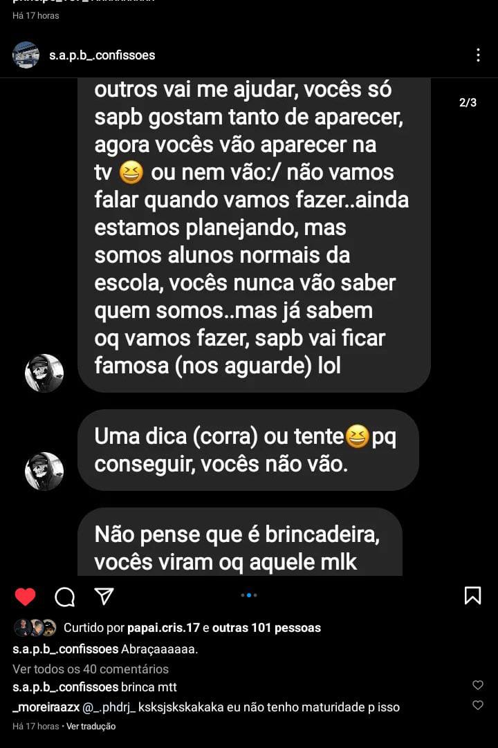 Vários prints passaram a circular entre os alunos após as postagens e aterrorizados, eles informaram os pais que correram para retirá-los da escola.