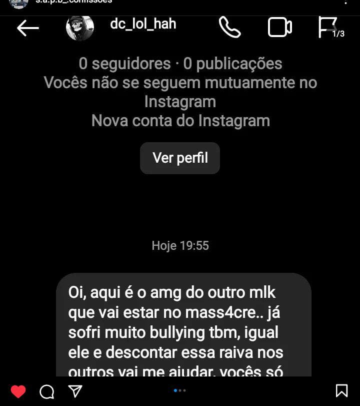 Nas publicações, o dono do perfil afirma que sofre bullying e que o ataque seria uma retaliação semelhante à que ocorreu há uma semana na escola Thomázia Montoro, na cidade de São Paulo, onde uma professora de 71 anos foi morta a facadas e outras cinco pessoas ficaram feridas.