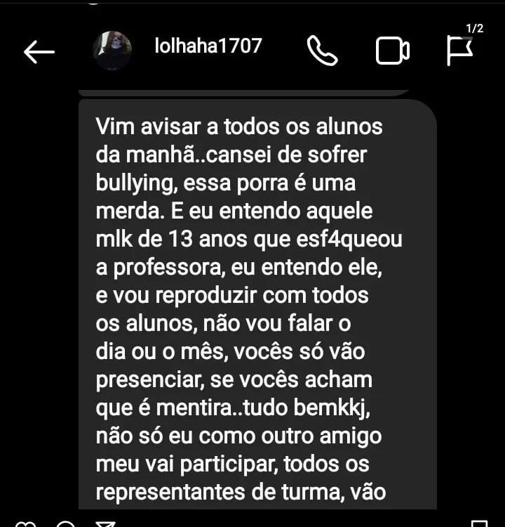 “Vim avisar a todos os alunos da manhã ... cansei de sofrer bullying, essa po*** é uma merda. E eu entendo aqueles mlk (sic) de 13 anos que esfaqueou a professora, eu entendo ele e vou reproduzir com todos os alunos, não vou falar dia ou mês vocês só vão presenciar”, diz uma parte do texto.