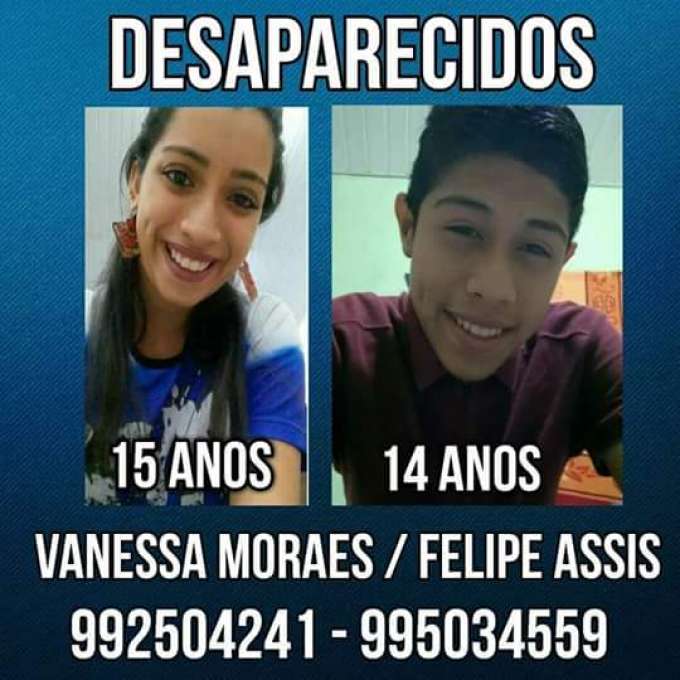 Manaus/AM - Vanessa Moraes, 15, e Felipe Assis, 14, estão desaparecidos desde a manha da última terça-feira(16), após saírem de casa para ir à escola no bairro Nova Cidade, zona Norte de Manaus. As famílias dos adolescentes fazem um apelo aos leitores do Portal do Holanda para localizá-los.
