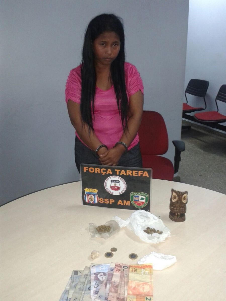 A Força Tarefa da SSP/AM prendeu em flagrante nesta quinta-feira (7) por tráfico de drogas Franciane Marques Pinheiro, 26 anos, vulgo "Francy", em sua residência localizada na rua Aluizio Donizete, bairro Colônia Oliveira Machado.