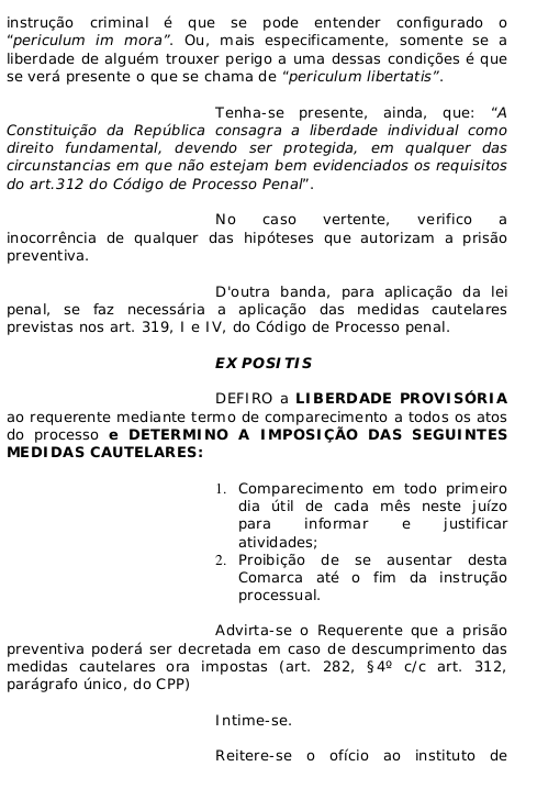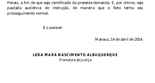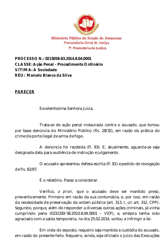 Parecer da promotora Leda Marta Nascimento Albuquerque, pela manutenção da prisão, uma vez que no seu entendimento o acusado deveria ser mantido preso,
