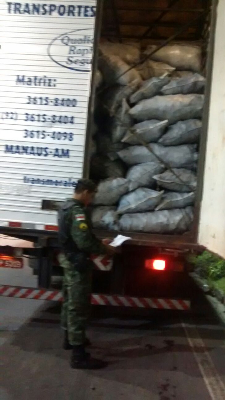 Os policiais militares armaram uma barreira durante a madrugada para fiscalizar os veículos que transportavam madeira ilegal pela rodovia. O caminhão Mecedes Benz, de cor azul e placas NOP-5209 estava transportando para Manaus 600 sacas de 20 quilos de carvão vegetal.