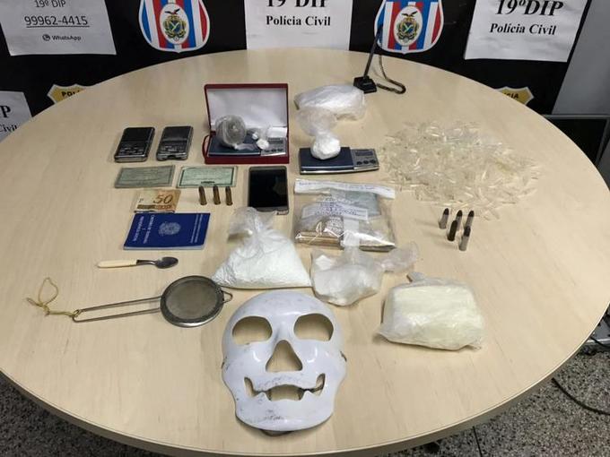 Segundo o delegado Tarson Yuri, no imóvel onde os suspeitos estavam os policiais civis encontraram uma porção média de maconha, duas trouxinhas de cocaína, uma balança de precisão, três munições de calibre 38, R$ 54 em espécie e uma máscara usada em festa a fantasia. Em um imóvel anexo à residência do casal foram apreendidos, ainda, quantidade não especificada de cocaína, balanças de precisão, quatro munições intactas e uma deflagrada de calibre 38, pinos plásticos para o acondicionamento do material entorpecente e R$ 2,6 mil em espécie.
