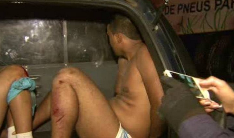 De acordo com a Polícia Militar, os assaltantes estavam fungindo pelo telhado do local, de cueca, quando foram presos.