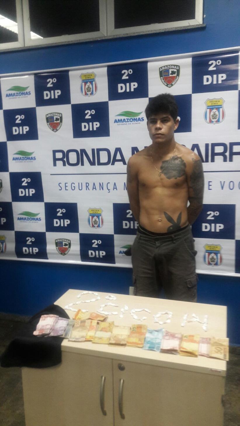 Manaus/AM - Na madrugada desta segunda-feira (9) um homem foi detido comercializando entorpecente na rua São Miguel, bairro Morro da Liberdade, zona Sul de Manaus. Ele foi identificado como Lucas Lima de Oliveira, 19. Policiais militares da 2ª Companhia Interativa Comunitária (Cicom) faziam o policiamento da área quando avistaram o homem em atitude suspeita. Com ele foram apreendidas 50 trouxinhas de entorpecente e a quantia de R$ 960,00 proveniente do tráfico.