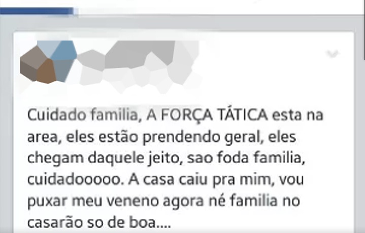 O trio foi encaminhado ao 15º DIP e deverão seguir para a Cadeia Pública Desembargador Raimundo Vidal Pessoa. Mas o que chamou a atenção foi uma postagem que supostamente teria sido realizada por um dos detidos no Facebook. Em sua mensagem ele pede para a “família" tomar cuidado pois a “Força Tática está na área… A casa caiu pra mim, vou puxar meu veneno… Agora né família no casarão só de boa”.