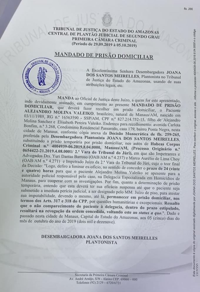 No Habeas Corpus concedendo prisão domiciliar a Alejando Molina, um dos suspeitos de envolvimento na morte do engenheiro Flávio Rodrigues dos Santos, a desembargadora Joana Meirelles fixou prazo de 24 horas para ele se apresentar e colaborar com a polícia, sob pena de ser considerado foragido.
