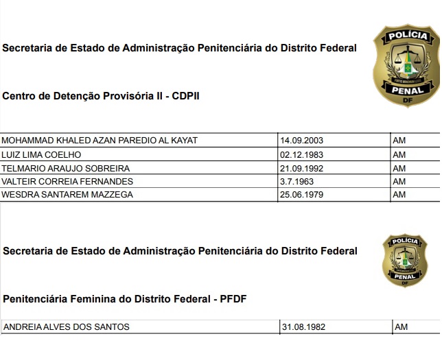 A lista com os nomes foi divulgada pela Secretaria de Administração Penitenciária (Seape) do Distrito Federal e mostra que os suspeitos estão nos presídios na ‘Papuda’ e na ‘Colmeia’ e devem responder por atos terroristas, associação criminosa, abolição violenta do Estado Democrático de Direito, golpe de Estado, ameaça, perseguição e incitação ao crime.